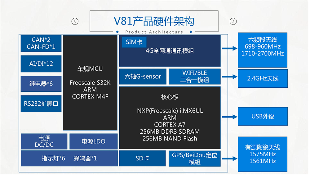We use I.MX6 to solve high-speed video capture and decompression, and pass the CAN bus data collected by S32K and SENSOR of peripheral GPS to the server through Qualcomm 4G module. It mainly solves the data problem from the acquisition end to the decision-making side. It builds the driving model through the collected vehicle CAN bus data such as vehicle speed, steering angle and gear position information, and builds samples, which are solved from the application service layer, application framework layer and component layer. ;